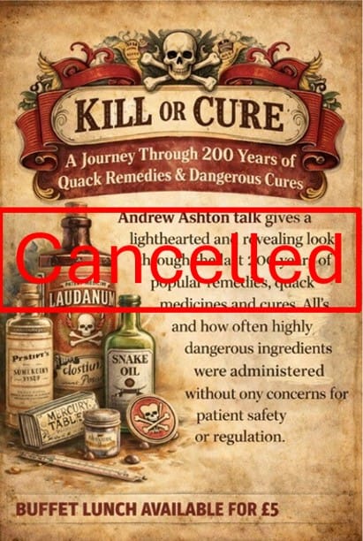 Unfortunately the talk about quack remedies has been cancelled due to the speaker’s illness. I am sure Andrew will be able to reschedule very soon.